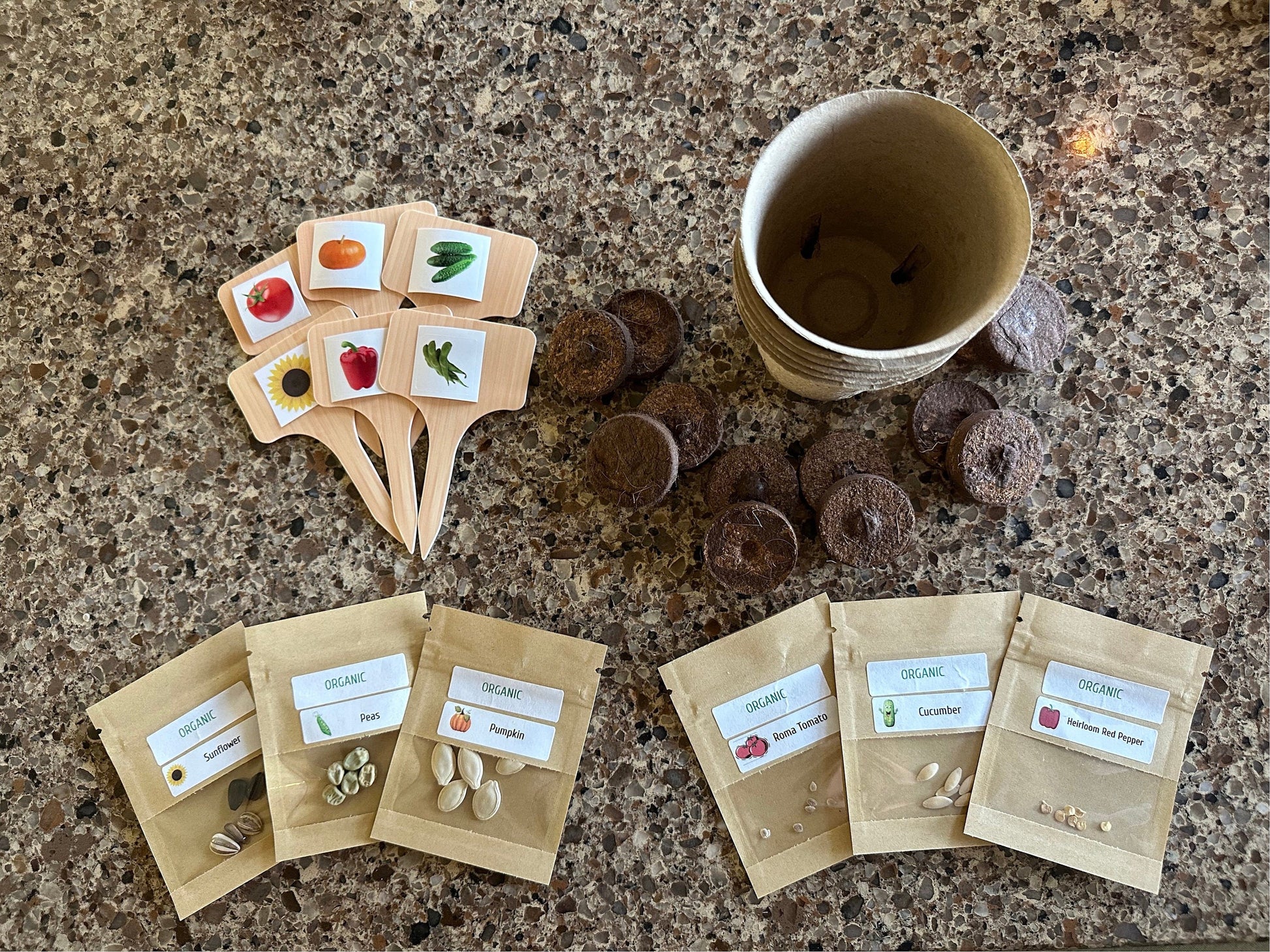 6 pot labels w/ corresponding stickers to mark your pots for each type of seeds Instructions on how to plant from start to finish.