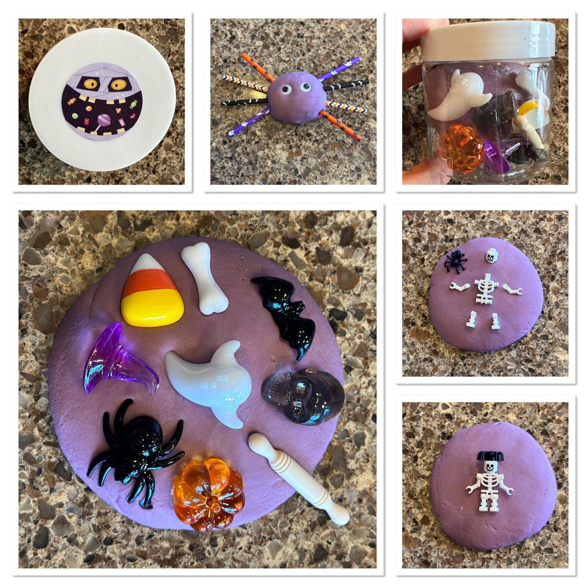 Organic Halloween Playdough sensory jar - HALLOWEEN - pumpkin, bat, ghost, skull, candy corn, bones, spider theme - add Lego skeleton kit &
